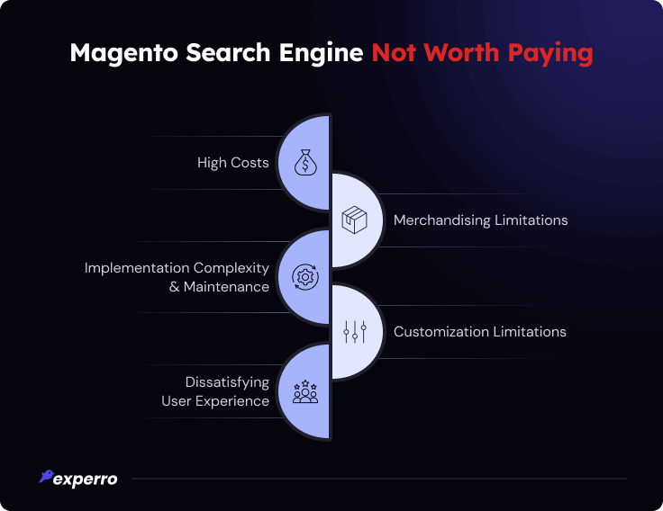 This includes the native Magento search engine and third-party solutions designed to enhance Magento site search. The high cost of maintaining and optimizing these search features often outweighs the benefits.