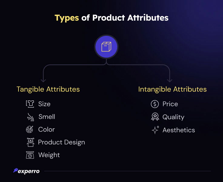 Attributes can be physical (like size, color, or material) or intangible (like brand reputation or customer reviews).