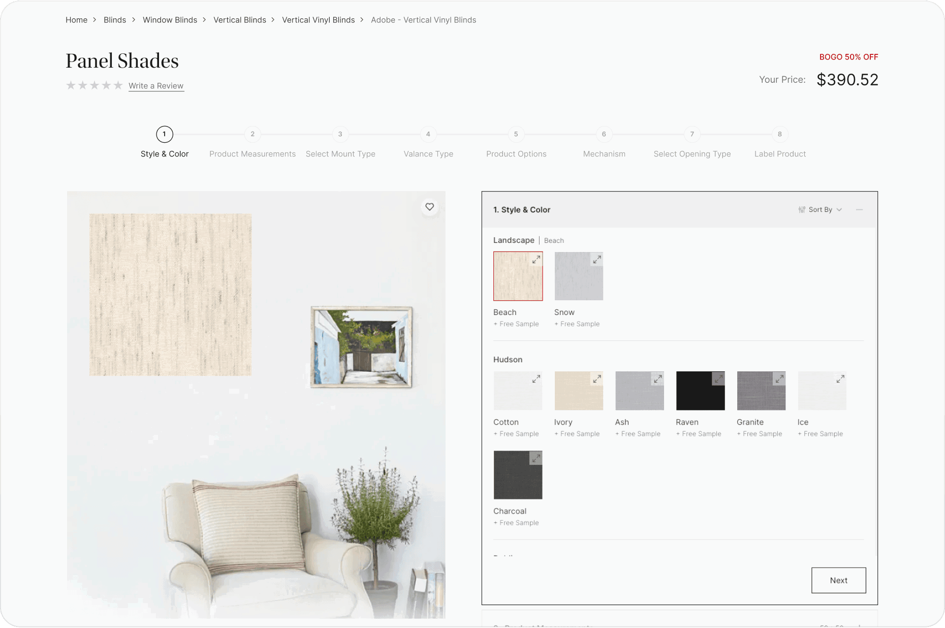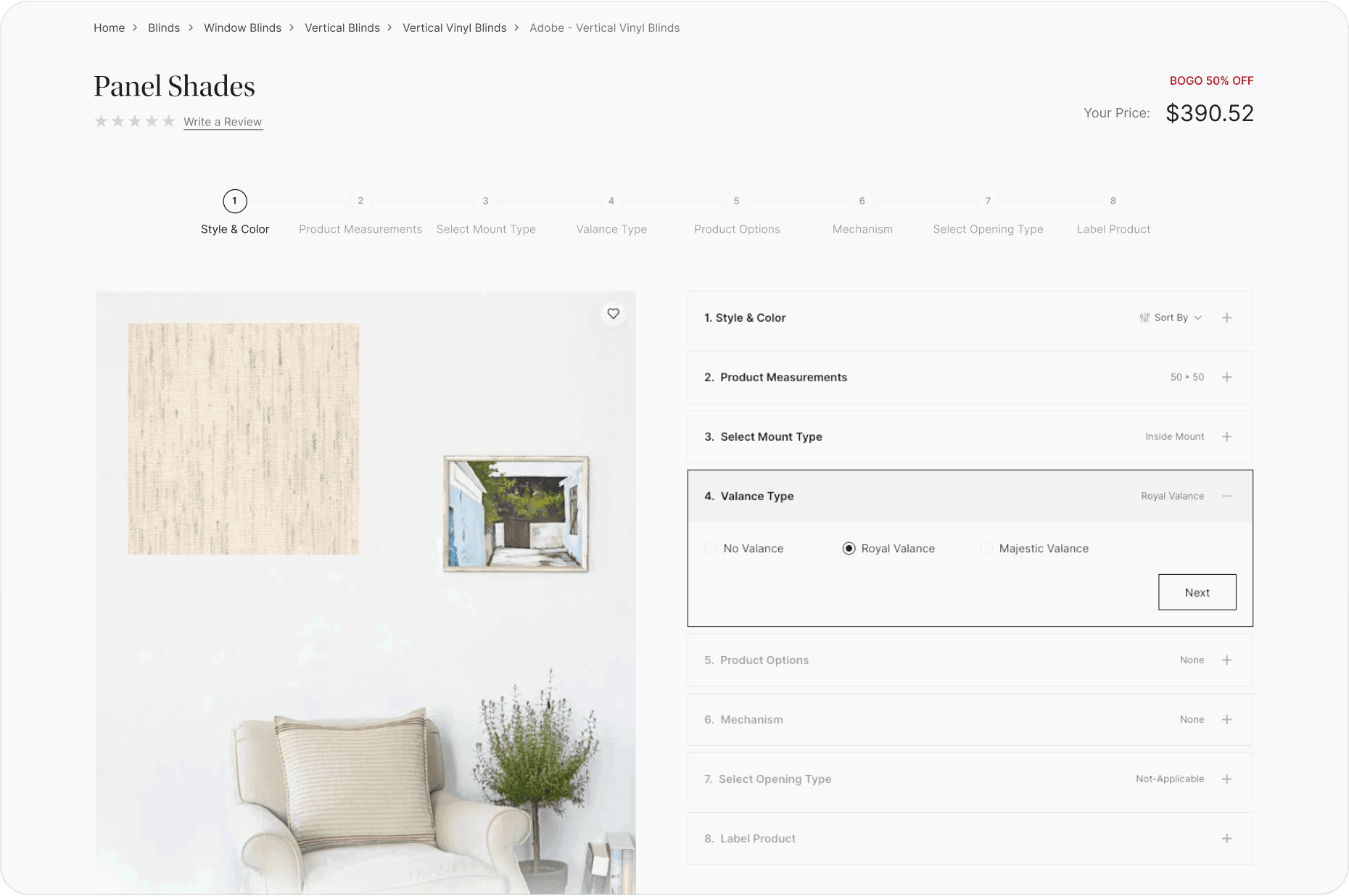The outdated system failed to meet current SEO standards and limited BTG’s capacity to cross-sell and upsell products effectively, as it lacked the necessary features and insights. Moreover, the absence of smart merchandising options — such as the ability to boost, bury, or promote specific products like blinds, shades, or drapes by type, size, or color — further restricted their ability to improve conversions.