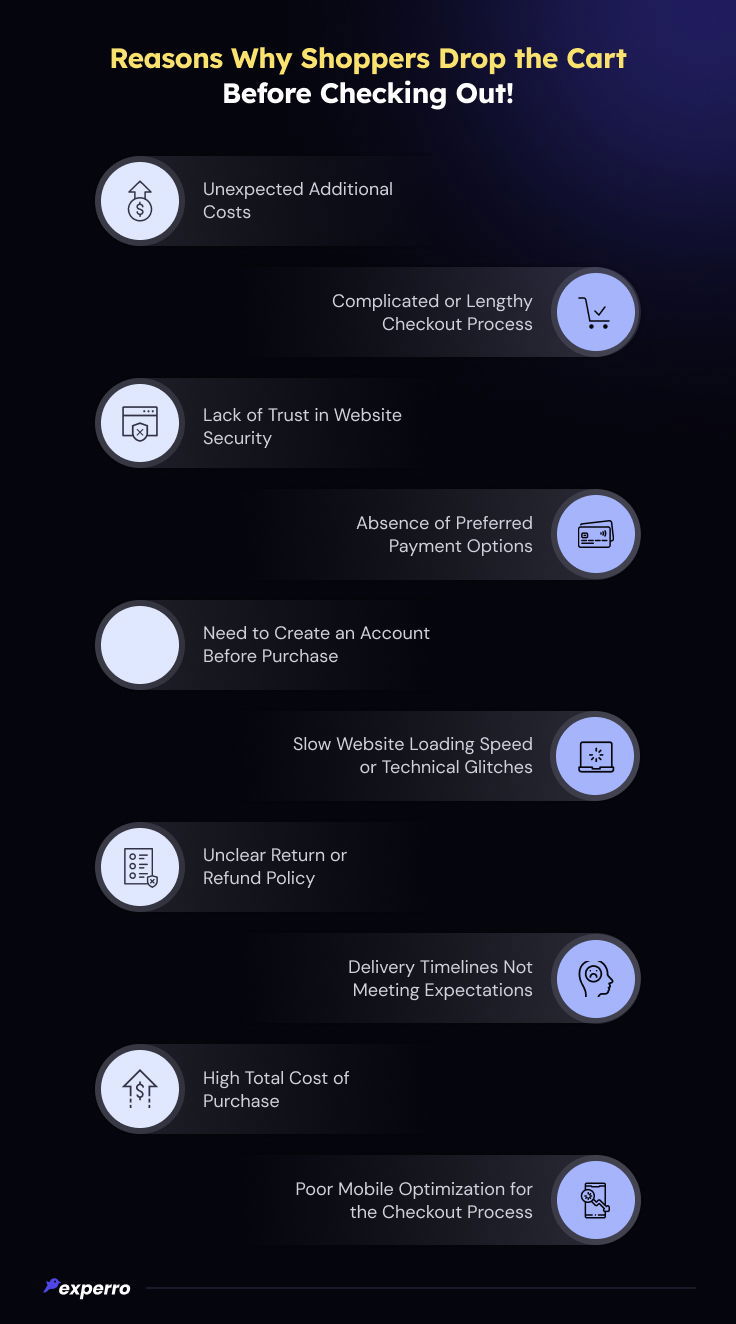 - Key factors like lack of trust in security, limited payment options, and poor mobile optimization often prevent shoppers from reaching the checkout stage, i.e., they abandon the carts.