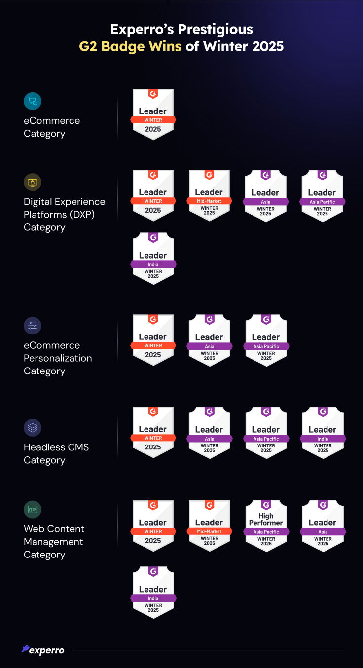 Recognition in the Digital Experience Platforms (DXP) category further validates Experro’s position as a leader in the DXP space. With its powerful blend of AI-driven insights, Experro helps businesses stay ahead in an increasingly competitive market.