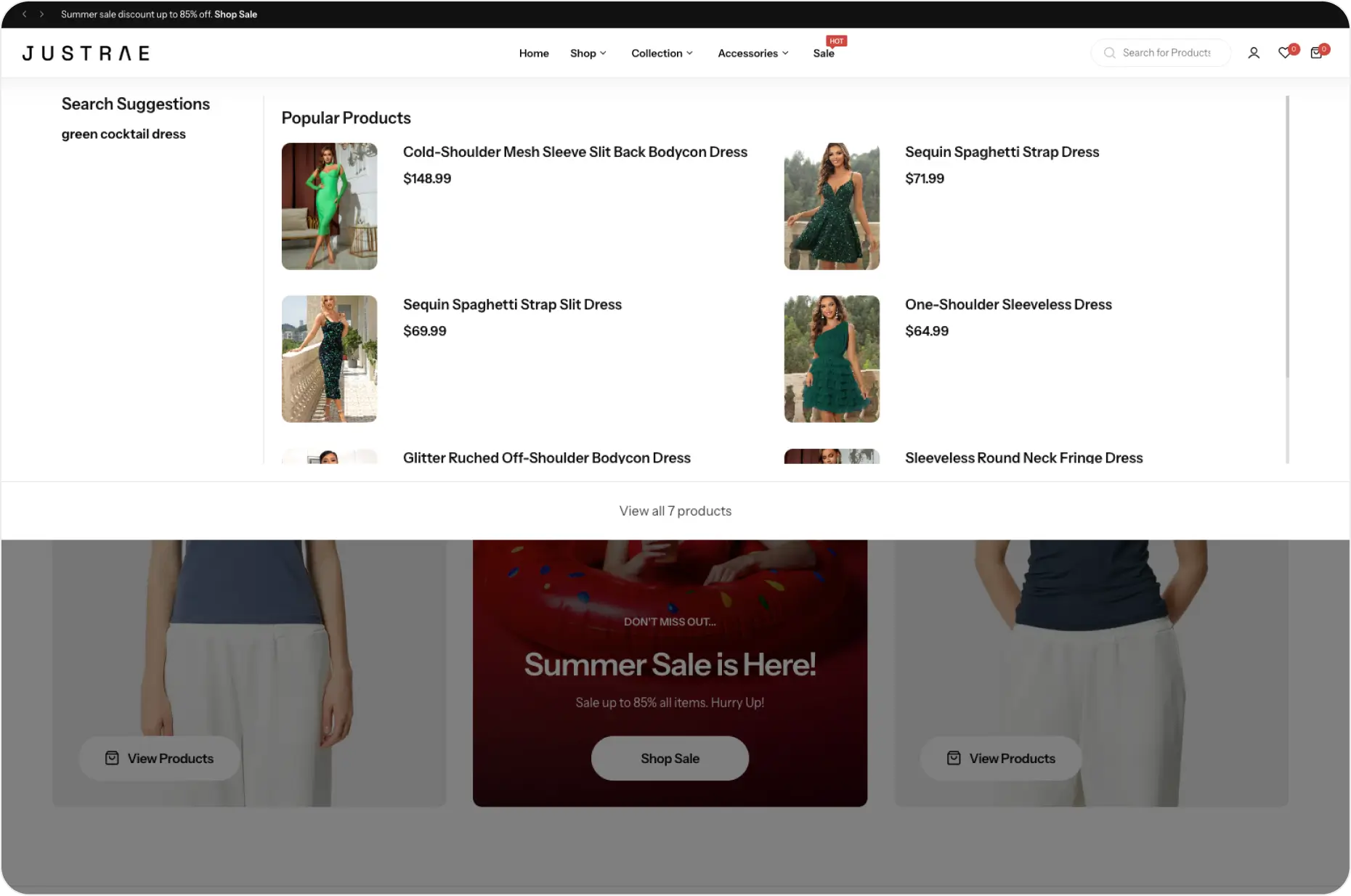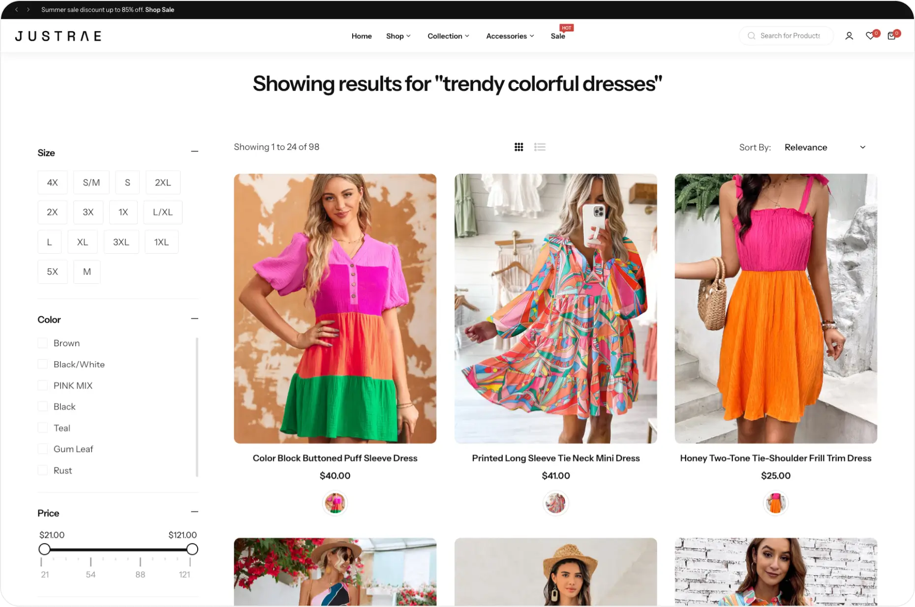 - Outdated Search Logic Justrae’s search engine couldn’t keep up with how fashion-savvy shoppers actually browse. It relied solely on keywords which failed to understand targeted queries like “red office outfit” or interpret visual cues like whether a dress looked formal. Without semantic or image-based understanding, relevant results were often buried, leading to drop-offs and missed conversions.