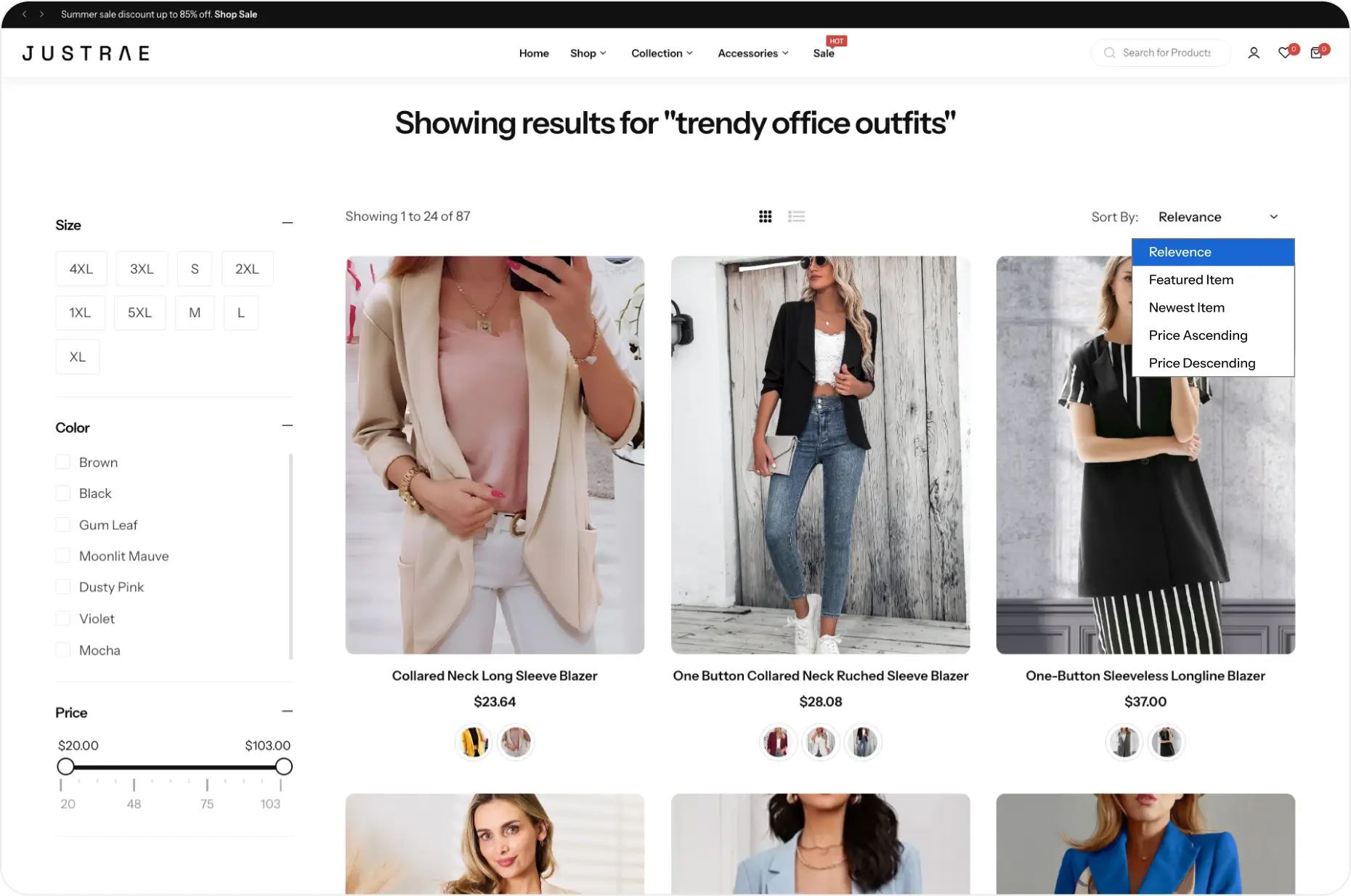 - Multi-Modal Relevancy Every query is matched harnessing the power of text, images, vectors, and behavioral signals. So when someone searches for an “elegant office dress,” the engine surfaces products that actually look elegant and office-ready, even if those exact words aren’t in the title. This search intelligence ensures shoppers see the right styles, faster.